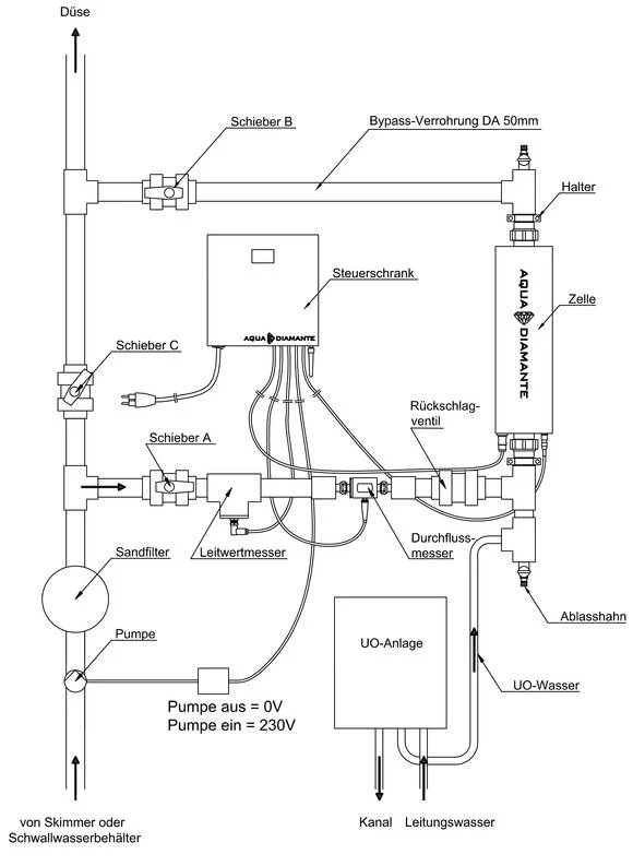 Die AQUA DIAMANTE Zelle, samt Durchfluss- und Leitwertmesser wird einfach in die Pooltechnik-Verrohrung mittels Bypass installiert (siehe Installationsschema). Für den Betrieb einer AQUA DIAMANTE ist die selbe Pooltechnik notwendig, wie sie in herkömmlichen Chlor- oder Salz-Pools verwendet wird. Die Auslegung der Becken-Hydraulik (Anzahl und Position der Einströmdüsen, sowie Umwälzzeiten) hat in Anlehnung an die Auslegung von Chlor-/Salzbecken zu erfolgen. Die sicherste Verteilung wird durch den Einbau von Bodendüsen (eine Düse pro 4 m²) in Kombination mit einer rundum Überlaufrinne erzielt. Je unvollkommener die Geometrie der Verteilung ist, desto höher muss die Umwälzrate bzw. desto länger müssen die Betriebszeiten der Umwälzung gewählt werden, um dennoch überall Oxidationsmittel anzuliefern. Bei Umrüstungen können bestehende Sandfilteranlagen, Pumpen und dergleichen weiterhin verwendet werden.